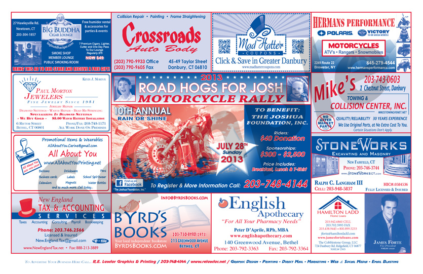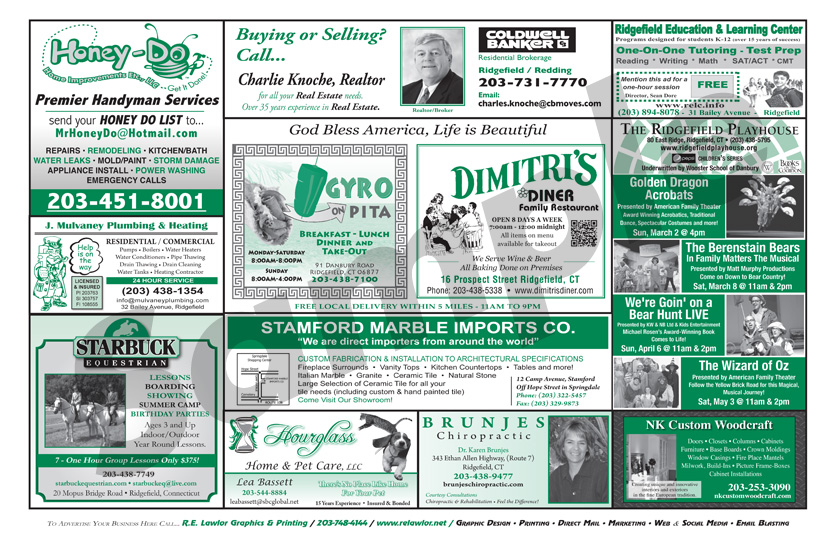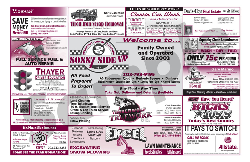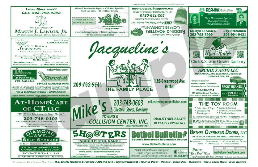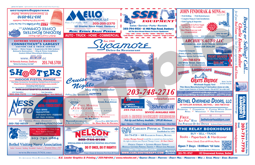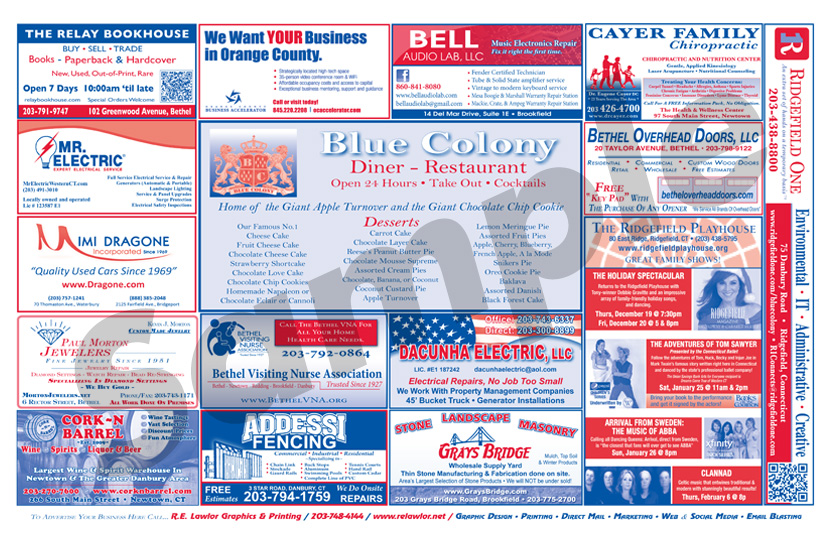 Advertise with R.E. Lawlor! Two million Place Mats are printed each year for diners and restaurants throughout Fairfield County, Connecticut. Place-Mat Advertising is highly visible and cost effective. You can reach thousands of potential customers and clients with an advertisement in an area that works best for you and your business. For one low monthly or quarterly fee you will receive a custom advertisement, printed on the Place Mats of your choice. Place Mat advertising works! Learn why this form of media advertising is the best option for you!